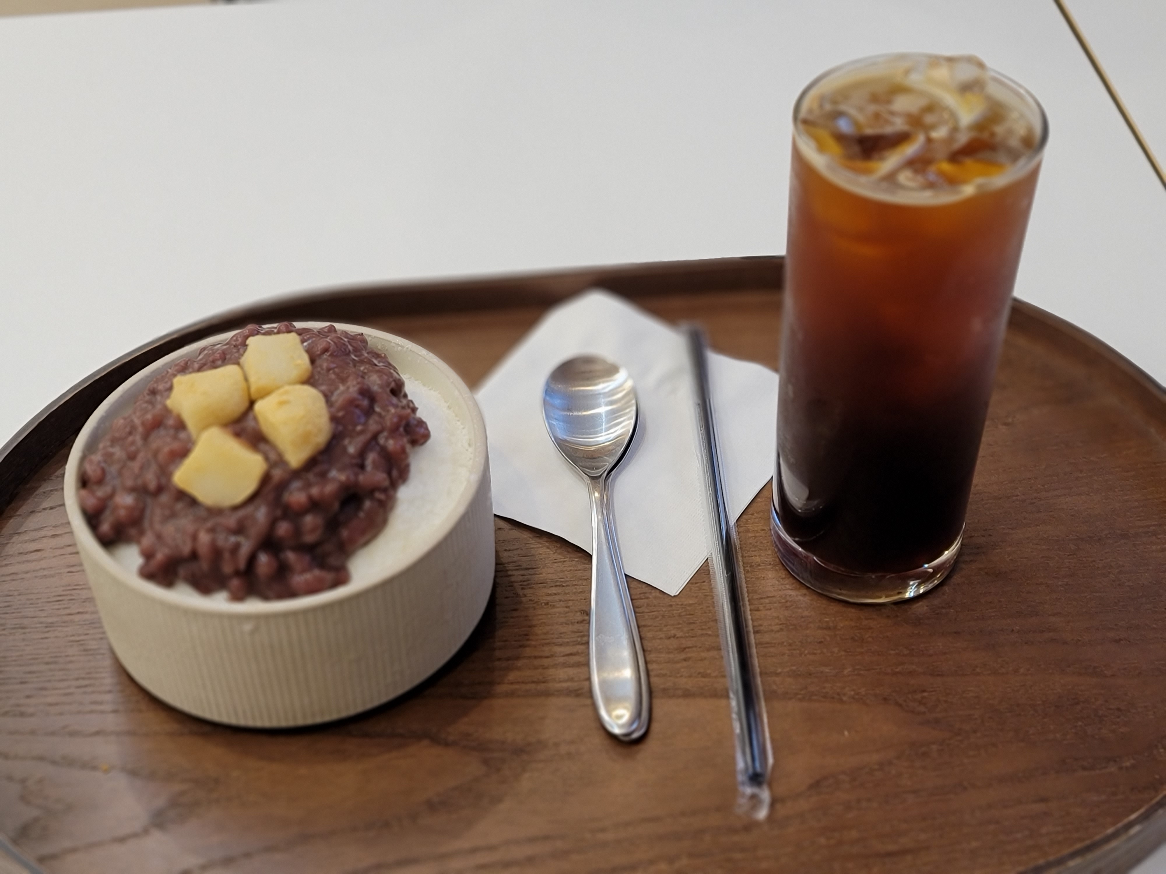 저희는 저녁 시간에 방문해서 돼지팥빙수와 아이스커피 그리고 팥맛 치즈맛 붕어빵을 먹었습니다. 아메리카노는 기본에 충실한 맛이었어요. 그리고 시그니처 메뉴인 팥빙수! 우유를 갈아 베이스를 깔고 그 위에 달지 않은 팥과 떡 고명이 올라가 있습니다. 전체적으로 달지 않고 시원한 느낌이 들어서 너무 맛있더라고요. 예전에 먹었던 밀탑빙수도 생각나고요.