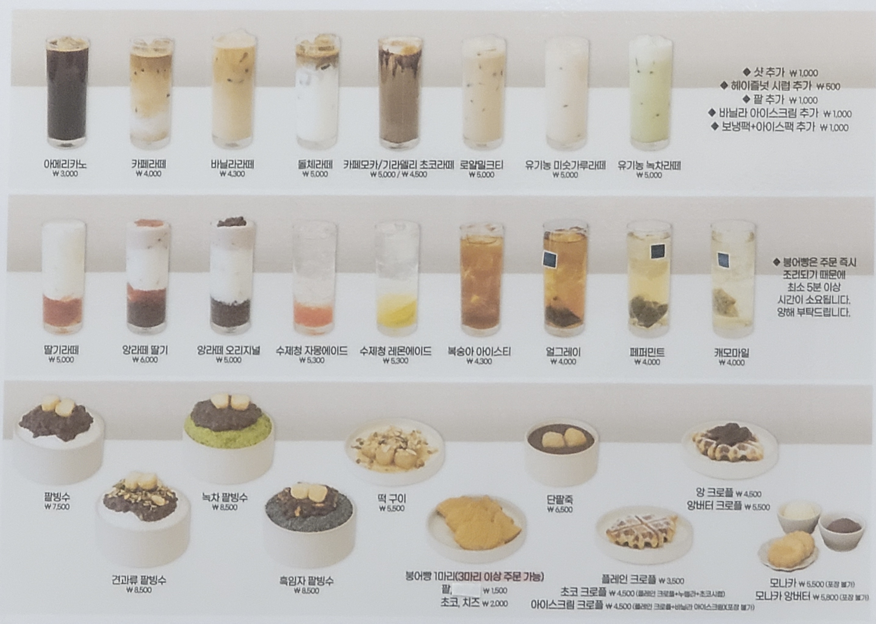달지 않는 팥으로 만든 돼지팥빙수, 단팥죽, 그리고 붕어빵와 음료들을 파는 디저트 카페랍니다.