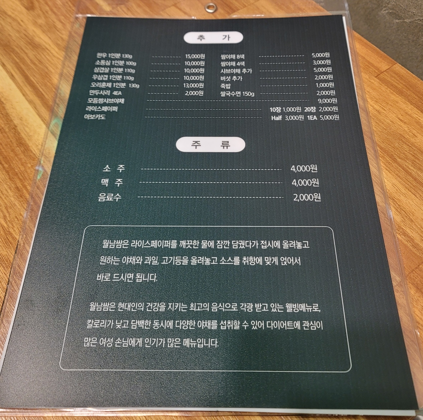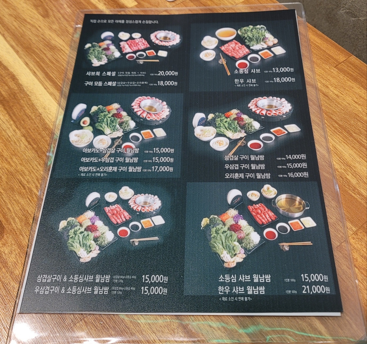 샤브샤브로 구성해서 먹을 수도 있지만 이 집의 대부분의 손님들은 고기+월남쌈 세트를 주문하는 것 같았어요. 저는 삼겹살+아보카도+월남쌈 세트를 시켜서 먹는답니다. 가격은 1인분에 15,000원이네요. 아보카도가 포함되어 있지 않으면 천원 저렴합니다.