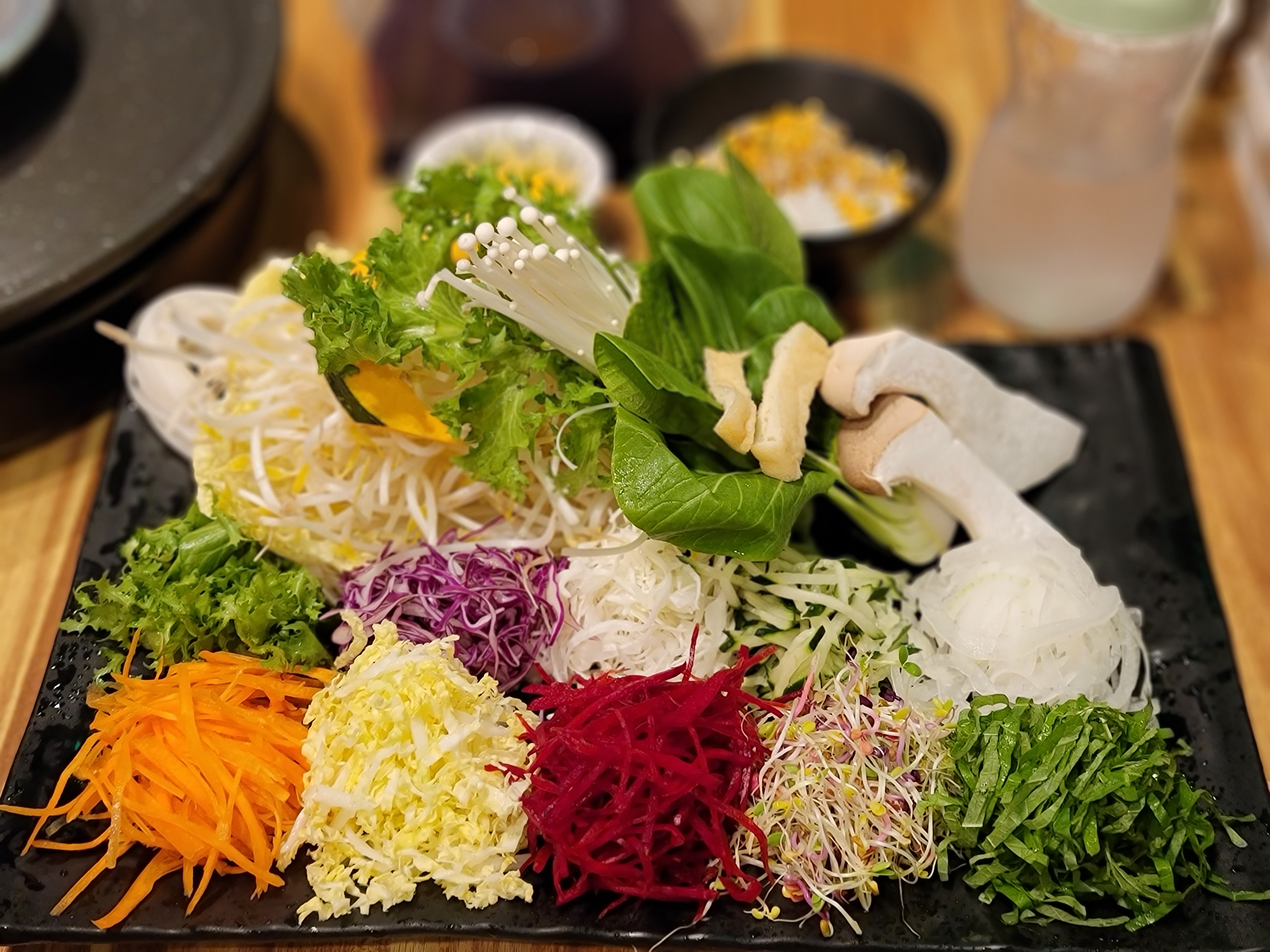 기본적으로 샤브샤브를 해 먹을 수 있는 육수와 야채가 제공된답니다. 야채의 절반은 육수에 살짝 담가먹고요. 나머지 생야채는 라이스페이퍼에 싸서 월남쌈을 해 먹습니다. 파인애플과 소스는 리필이 되니 부족하면 더 달라고 하시면 됩니다. 월남쌈은 파인애플과 소스맛 아니겠어요^^ 육수 바깥으로 고기를 올려 굽습니다. 월남쌈에 구워진 얇은 삼겹살의 고소함이 잘 어울려서 맛있더라고요.