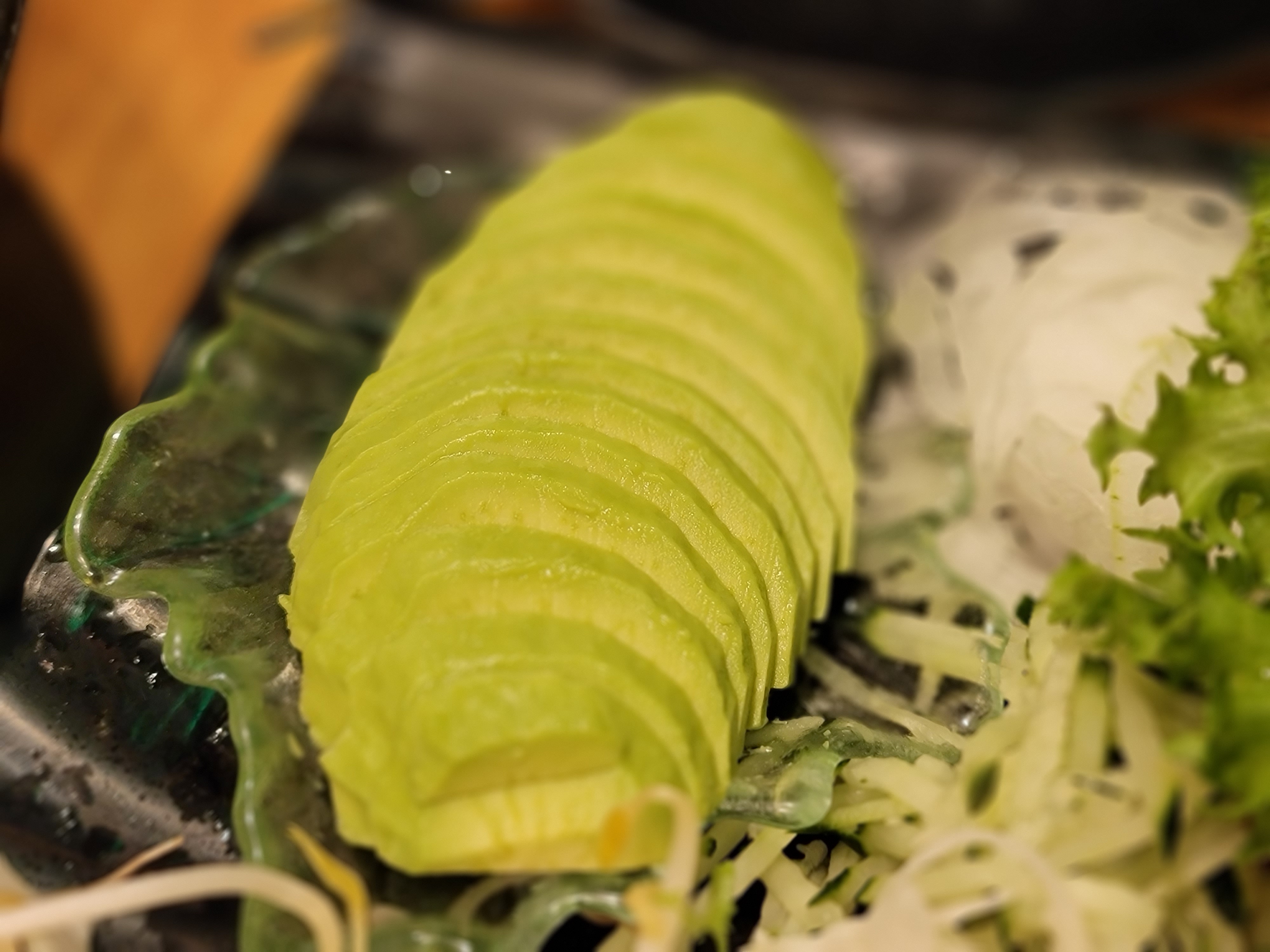 아보카도가 포함된 삼겹살과 월남쌈 세트를 시키니 아보카도 반개가 잘라져 나왔답니다. 아보카도는 숲 속의 버터라고 불리는 지방함량이 높은 과일입니다. 아보카도 오일은 불포화지방산이 많아서 콜레스테롤 수치를 낮추는데 도움이 된다고 해요. 또 혈압을 낮추는 칼륨이 많이 들어있다고 합니다. 칼륨은 몸의 불필요한 노폐물을 밖으로 내보내는 역할을 해서 혈압을 낮춰주는 효과가 있다고 하네요. 삼겹살을 구워 먹으니 아보카도를 함께 먹으면 조금 더 건강을 챙기는 것 같은 느낌적 느낌이 드네요^^;