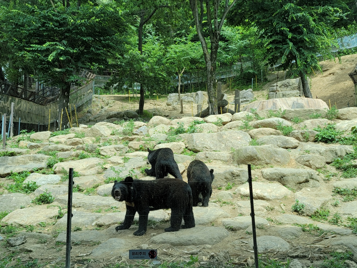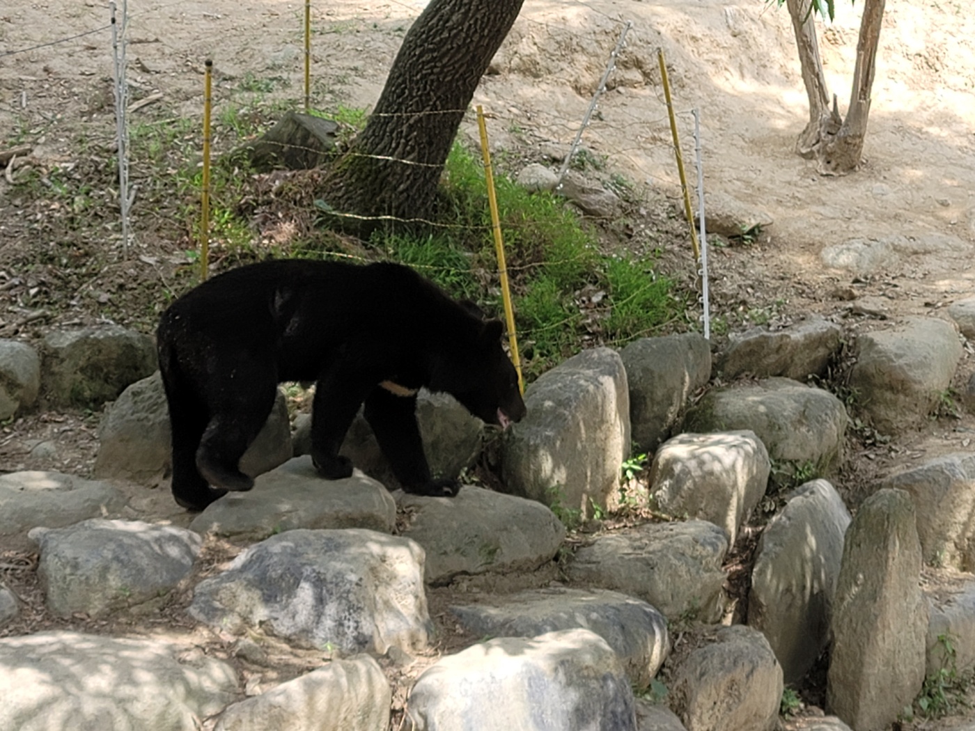반달가슴곰은 나무를 잘 탄다고 해요. 그래서 사육장 주변에 나무들이 많이 얇아져 있었어요. 나무가 모두 없어지면 그늘이 없어져 몇 개의 나무는 오르지 않도록 해두었네요. 물놀이도 하고 장난도 치며 평화롭게 지내는 모습이었습니다. 직접 눈으로 보니 한없이 온순해 보이지만 실제로 만나면 안전을 위해 도망가야 한다고 하네요.