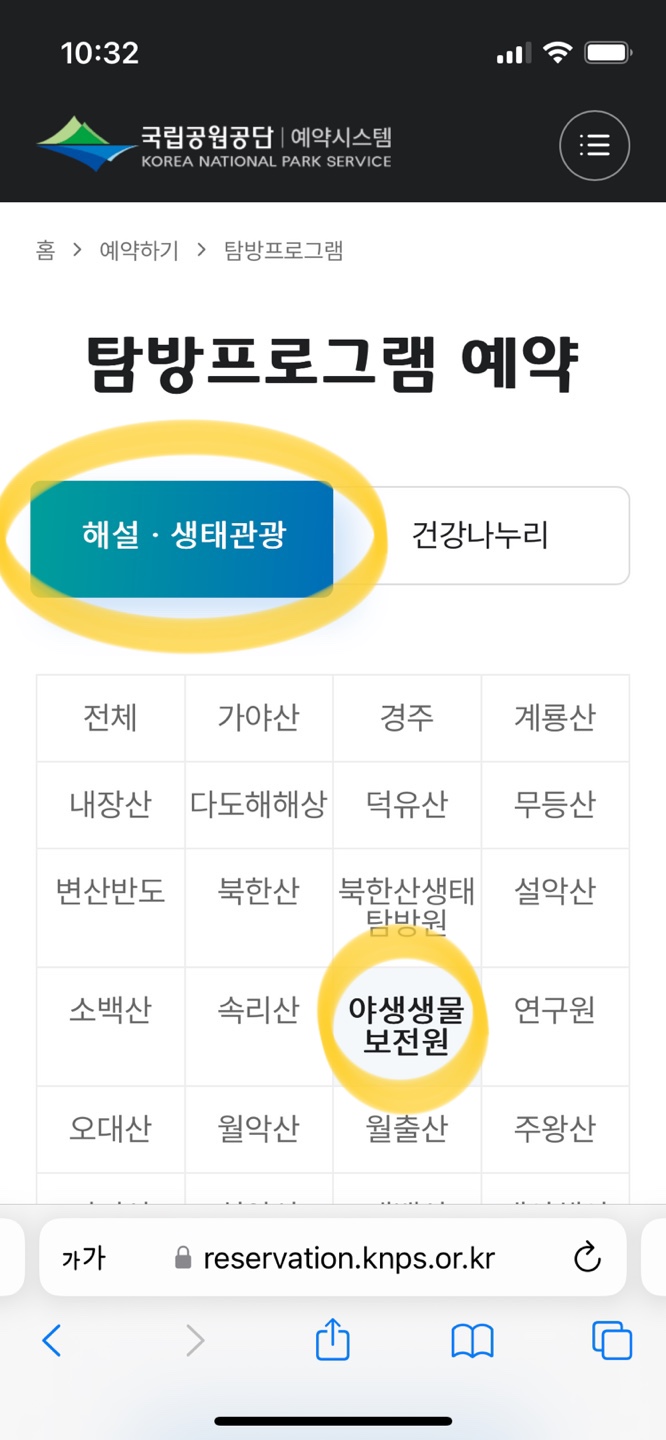 탐방프로그램 중 해설, 생태관광을 누르면 아래에 카테고리 중 야생생물보전원을 선택합니다.
