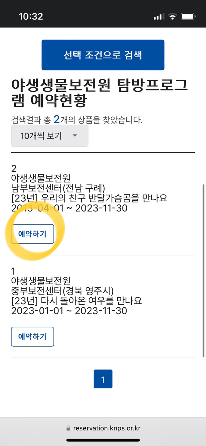 현재는 두 개의 탐방프로그램이 보입니다. 그중 우리의 친구 반달가슴곰을 만나요 예약하기를 누릅니다.
