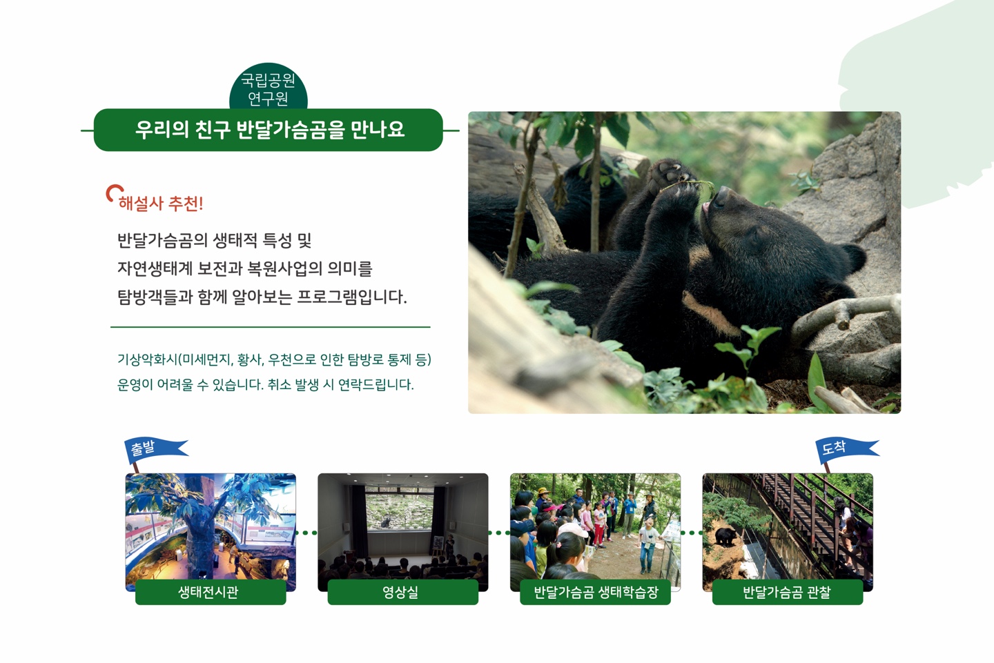 국립공원 탐방프로그램은 국립공원 내에서 활동하고 있는 활동들과 역사 그리고 지키고 싶은 자연유산에 대한 즐거운 이야기를 전하는 교육을 진행함으로 생물의 다양성을 보전하고 복원하는데 힘쓰고 있답니다. 전남 구례 남부보전센터에서는 반달가슴곰 탐방 프로그램을 진행한답니다. 반달가슴곰의 과거와 현재, 그리고 앞으로의 숙제들을 알아보고 직접 관찰하는 프로그램으로 이루어져 있답니다.