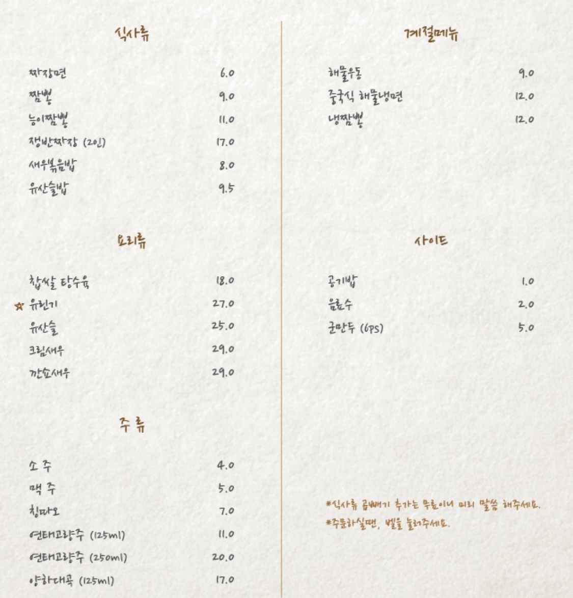 메뉴는 기본메뉴인 자장면과 짬뽕이 있습니다. 이곳은 능이짬뽕이 있는데 능이 버섯이 들어간 하얀 국물의 베이스의 짬뽕이랍니다. 매콤한 짬뽕을 원하시면 기본 짬뽕을 드세요. 유린기가 시그니처 메뉴랍니다. 또 계절에 따라 냉짬뽕이 나오기도 한답니다.