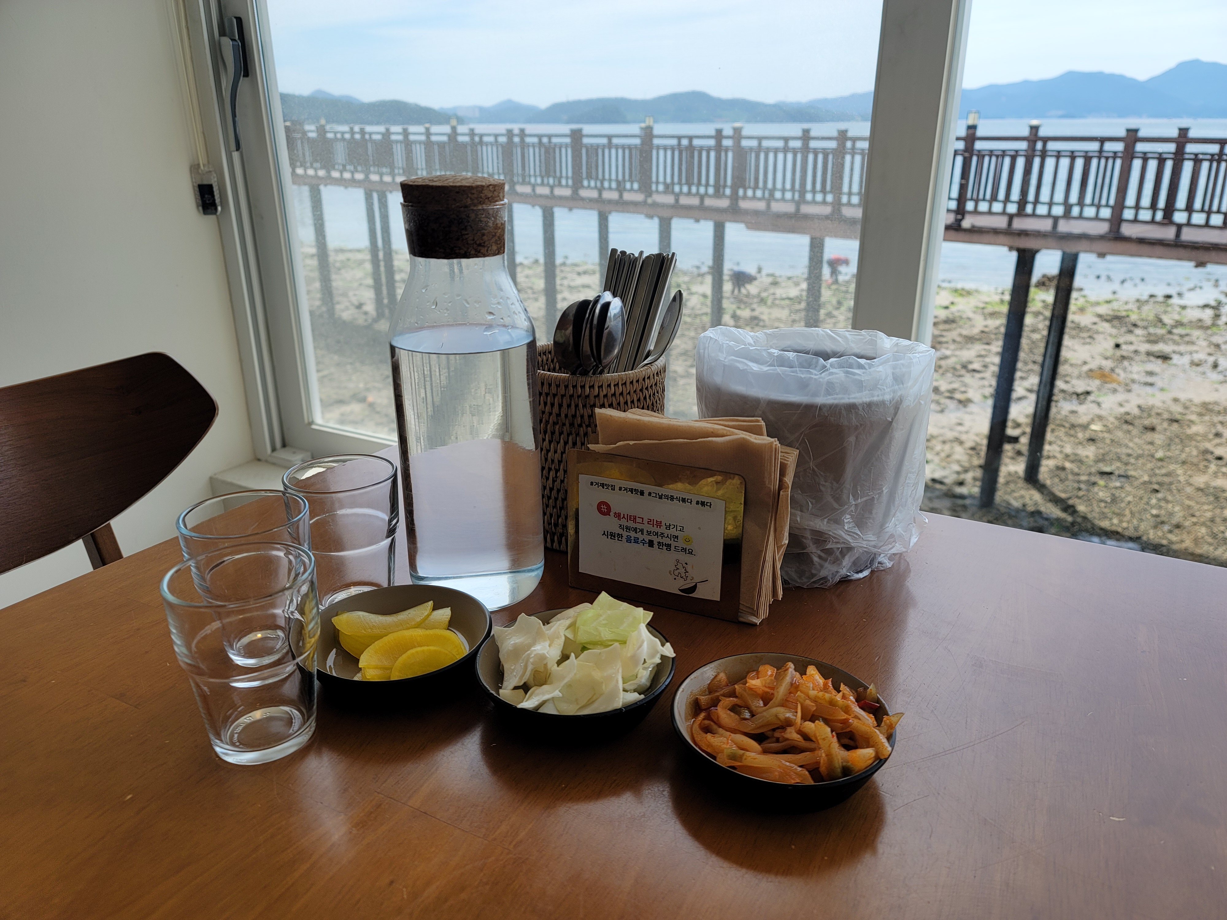 그날의 중식 볶다는 사등면에 위치한 중식당인데요. 음식을 먹으며 통창으로 보이는 뷰가 아주 근사하답니다. 특히 노을이 지는 시간대에는 정말 끝내준다고 하니 저녁에 가보시는 것을 추천합니다. 또 가게 밖으로 조금만 걸어가면 바닷길을 걸어볼 수 있는 산책로가 있습니다. 그래서 밥 먹고 꼭 한 바퀴 산책을 하고 온답니다. 또 온더선셋이라는 유명한 커피집이 있어요. 이곳은 다음에 한번 정리해 보도록 하겠습니다.