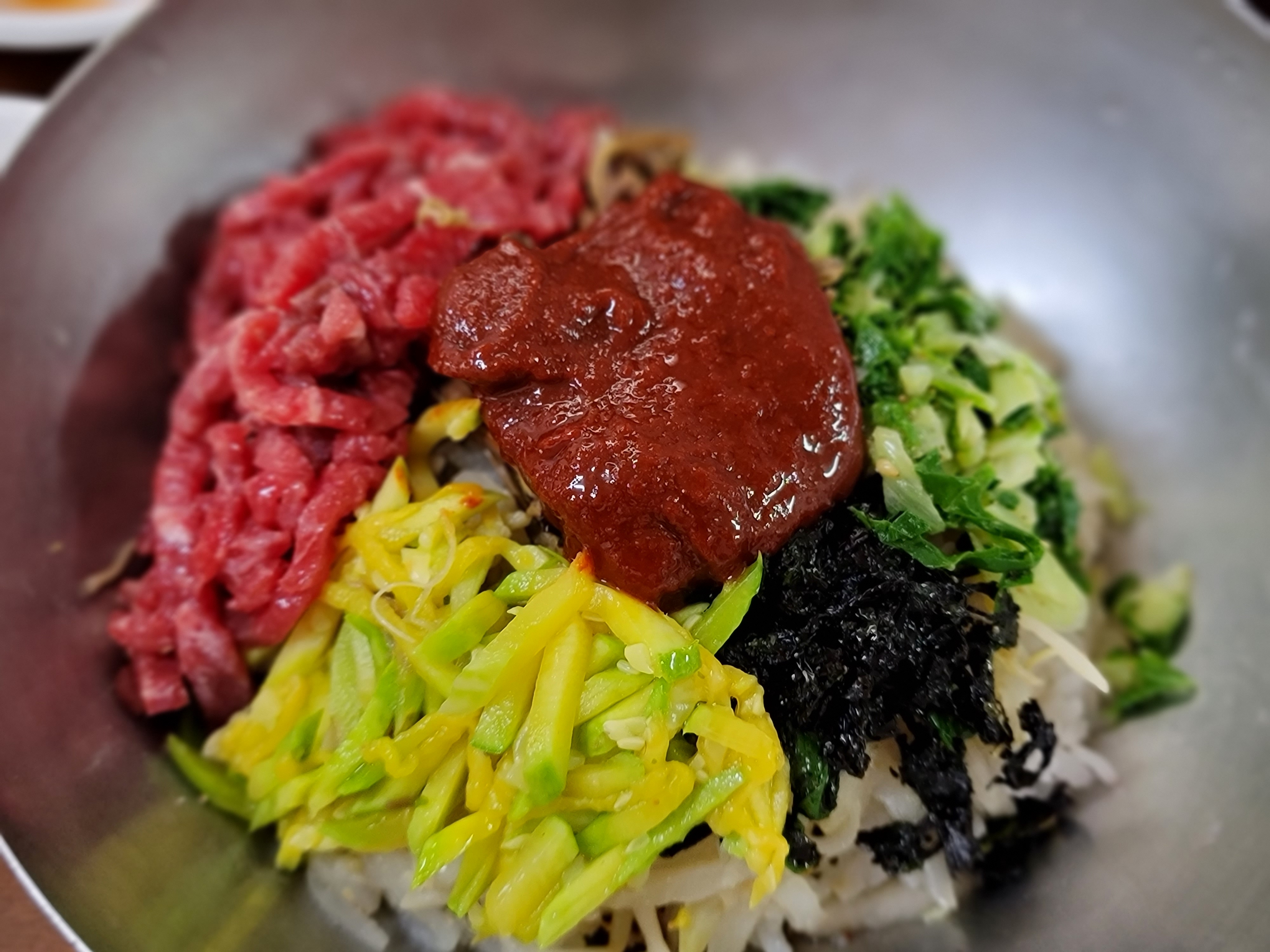 국내산 한우 육회가 들어가고 볶은 야채들이 들어간 비빔밥입니다. 고추장이 조금 많은 듯해서 조금 덜어 먹었답니다.