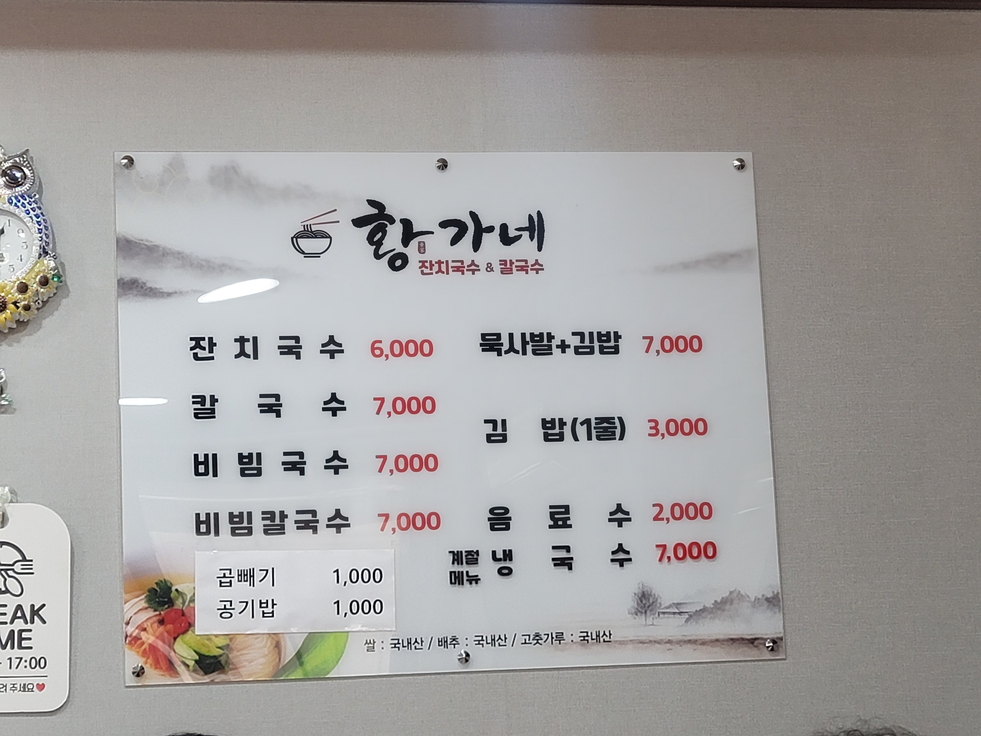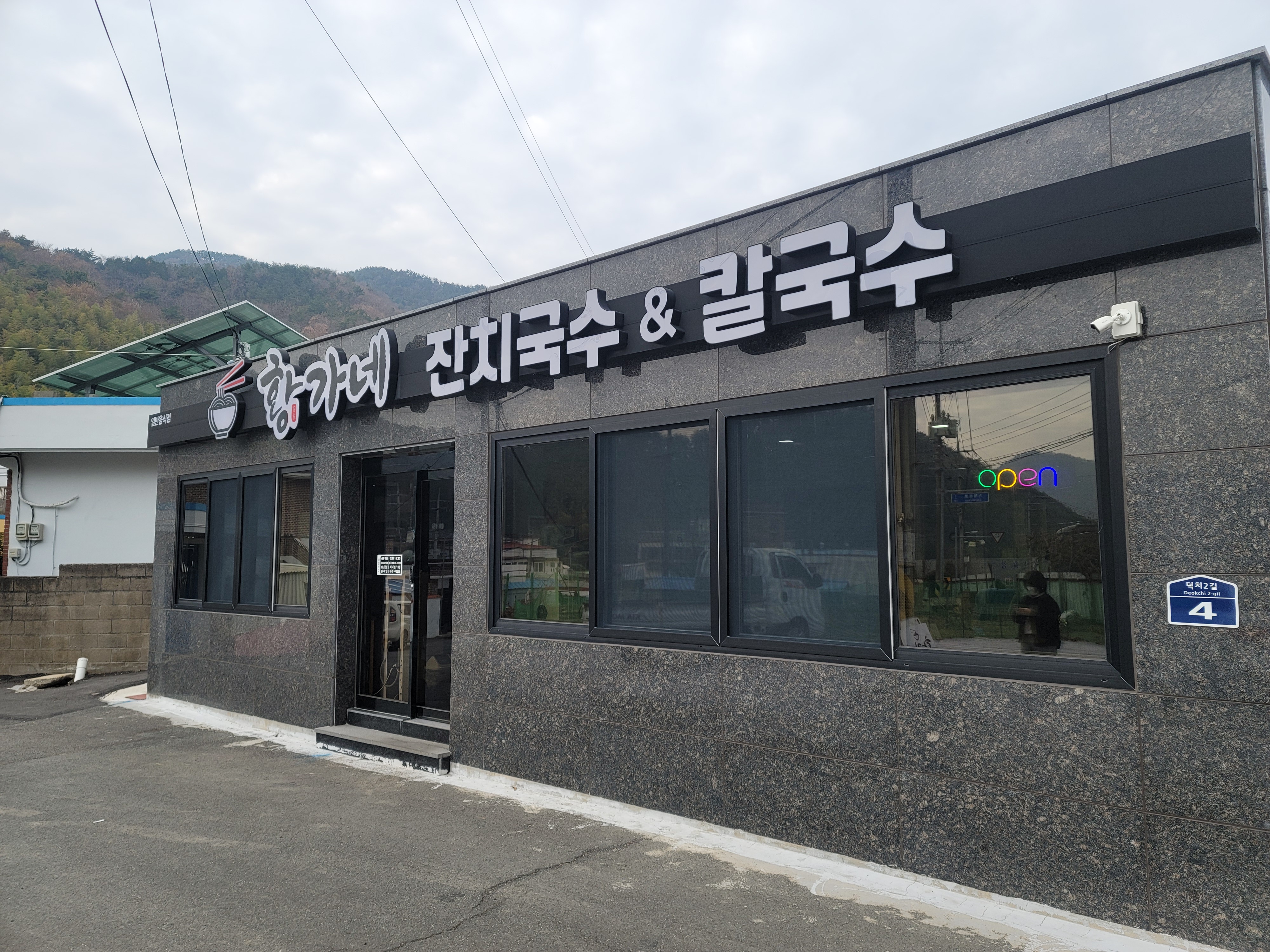 원래 황가네 잔치국수는 하청도서관 뒤쪽에 있는 국수집이었어요. 그때도 자주 갔었는데, 새로 건물을 지어서 이전하셨더라구요. 1층 크기의 깔끔한 외관으로 재탄생했답니다.