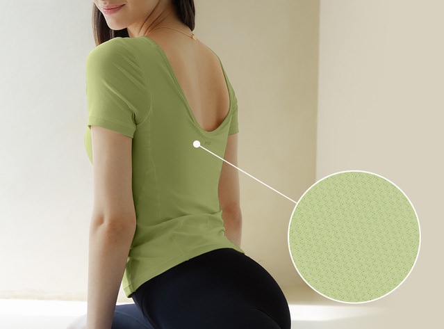 적당한 핏감으로 피부에 부드럽게 닿는 소재의 상의입니다. 매쉬 소재와 자외선 차단 기능이 있어 야외 수련 시 입기 좋을 것 같네요.