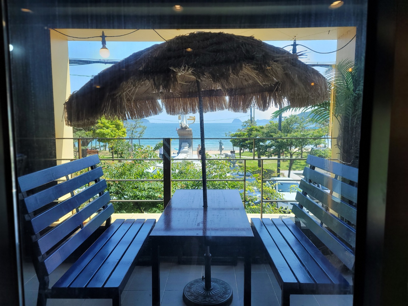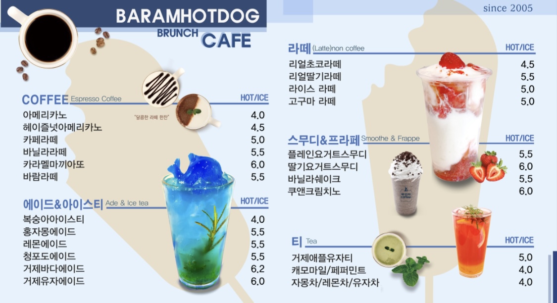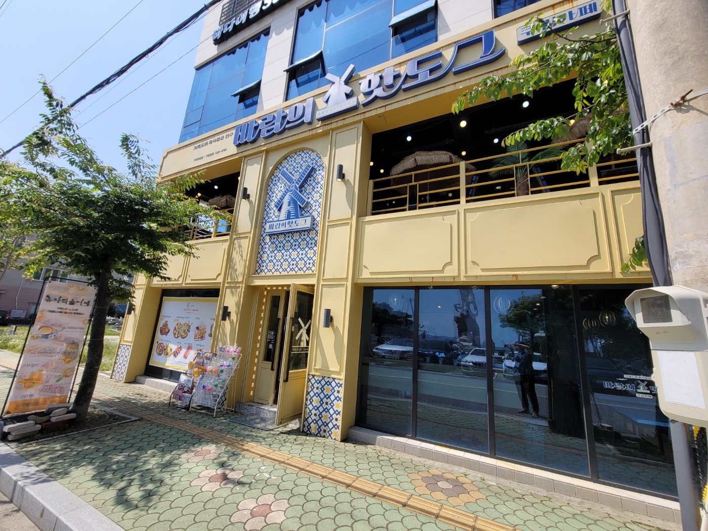 깔끔하고 시원한 실내와 마치 외국 여행을 온 듯한 느낌을 주는 파라솔이 2층 바깥에 쳐져있어 여행을 온 것 같은 기분이 들었어요. 밖에서 먹으려다가 바람이 너무 많이 불어서 안으로 들어갔습니다. 바람의 핫도그답게 바다 바람이..ㅎㅎ