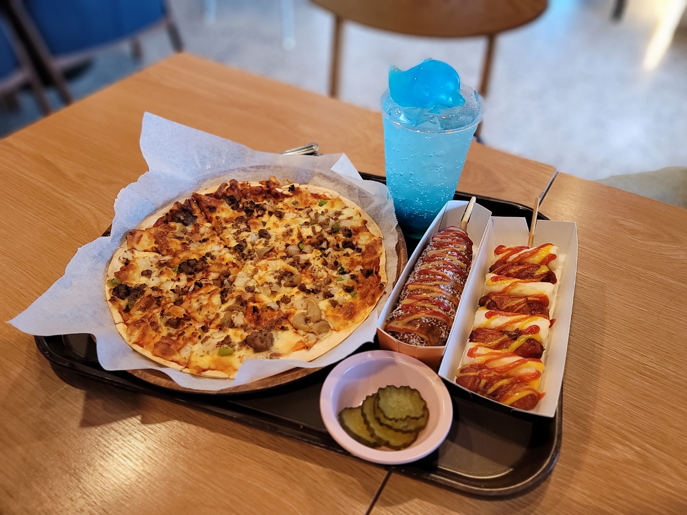 저희는 기본 핫도그와 소떡소떡 피자 그리고 거제 바다 에이드를 시켜서 먹었답니다. 에이드 위에 올라간 파란 돌고래를 보고 아이가 무척 좋아했답니다. 해수욕장에서 놀다가 방문한 카페에서 간단히 요깃거리 하며 시간을 보냈어요. 즉석으로 만드는 핫도그는 아니지만 소스와 함께 먹으면 맛있게 먹었답니다. 다만 가격이 저렴하게 느껴지지 않는 것이 아쉬웠어요.