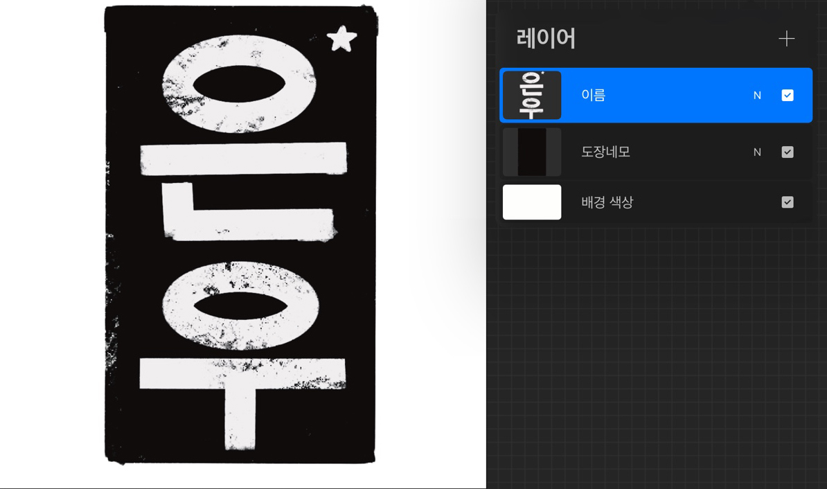 저는 거칠고 각진 느낌을 주고 싶어서 브러시-페인팅-니코 룰을 이용해 그림을 그렸습니다. 검은 직사각형 배경에 흰색으로 이름을 적어 주었습니다.