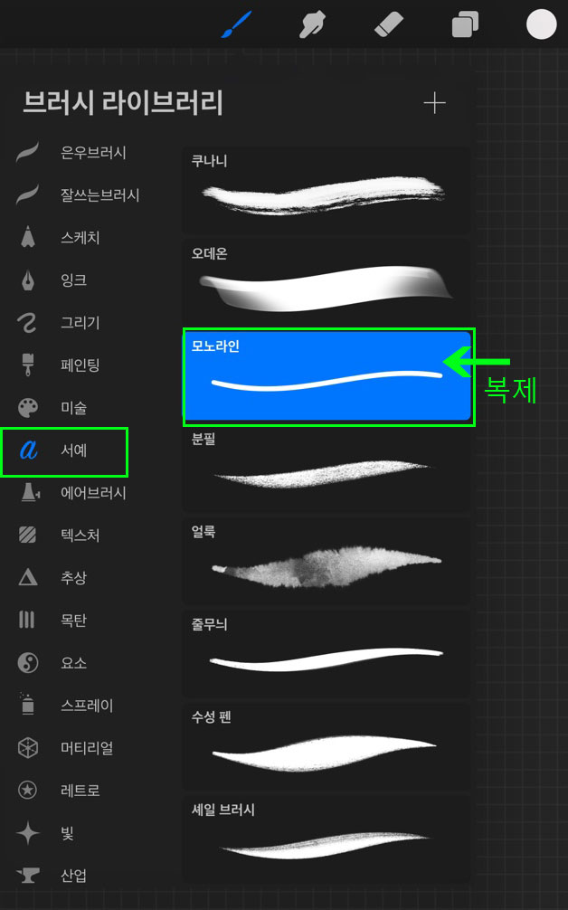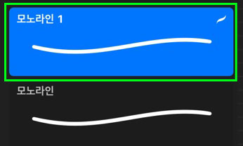 새로운 브러시를 만들기 위해 가장 무난한 브러시를 복제해 설정을 변경하도록 하겠습니다. 저는 서예-모노라인 브러시를 복제하도록 하겠습니다. 모노라인 브러시 위에서 손가락을 왼쪽으로 밀면 복제창이 뜹니다. 복제된 모노라인 1이 생성된 것을 확인할 수 있습니다.