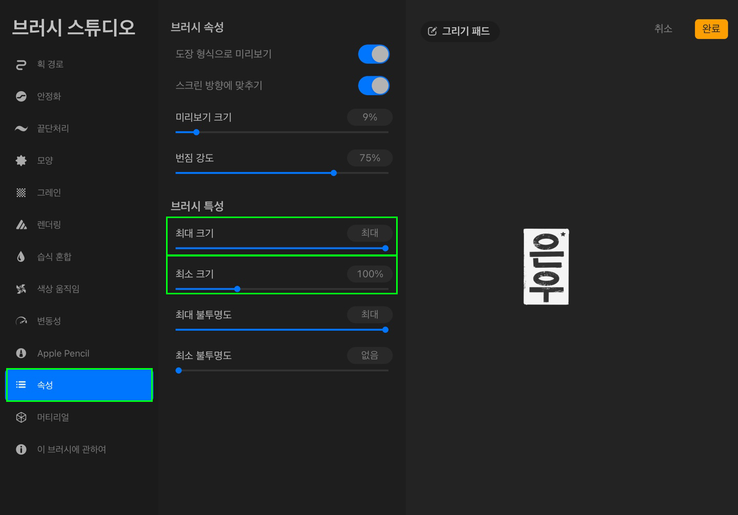 브러시 스튜디오 - 속성 - 브러시 특성 - 최대 크기:최대 - 최소크기:50%