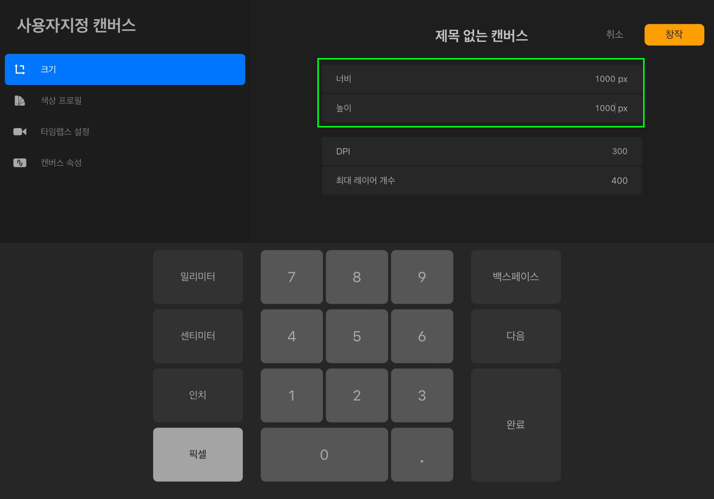 저는 가로 1000px, 세로 1000ox로 설정하도록 하겠습니다.