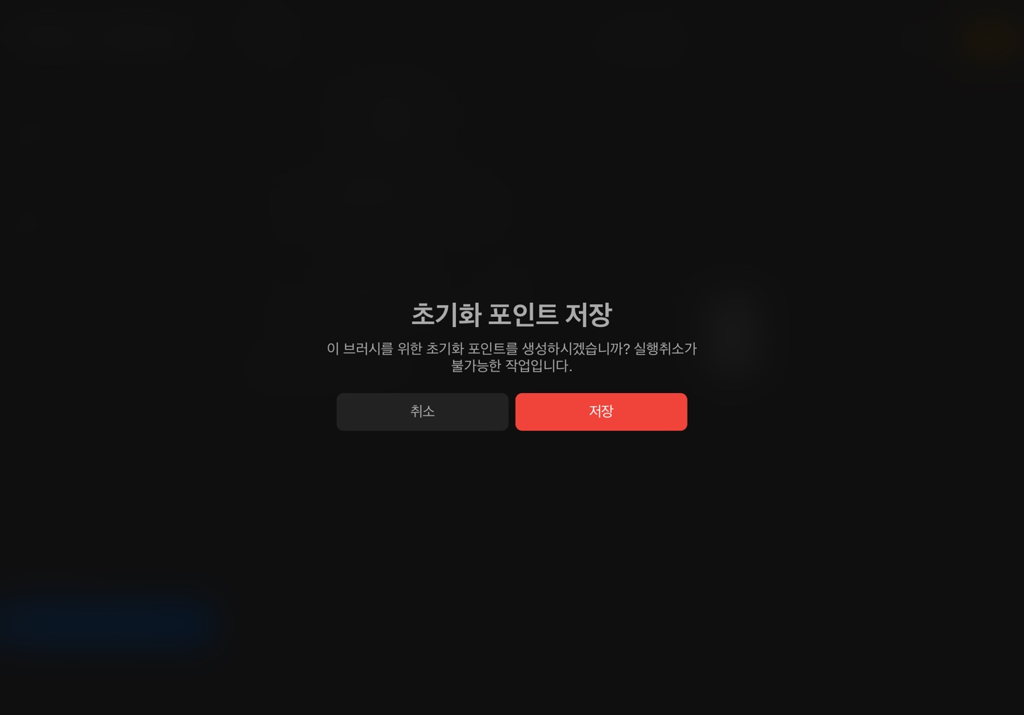 내가 만든 브러시의 이름을 변경하도록 하겠습니다. 브러시 스튜디오에서 이 브러시에 관하여를 선택합니다. 브러시 이름과 제작자 서명을 해줍니다. 그리고 새로운 초기화 포인트 생성을 선택해 저장해 줍니다. 이는 브러시의 설정값이 기본 값으로 돌아가지 않도록 잠궈주는 효과를 가집니다. 완료를 눌러 브러시 설정을 완료합니다.