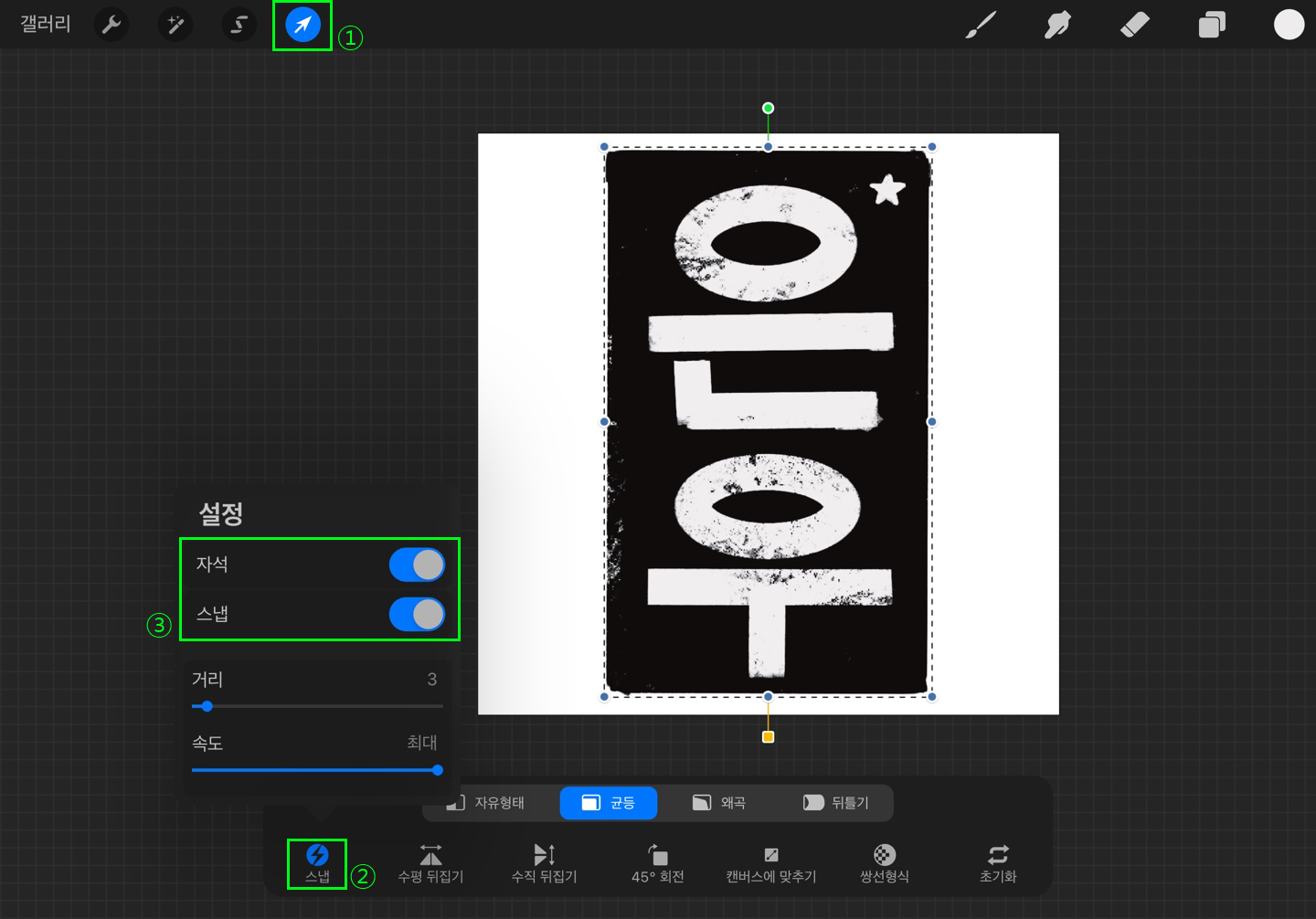 각 레이어를 오른쪽으로 밀어주어 레이어를 모두 잡아줍니다. 선택 버튼을 누르고 스냅을 선택해 주면 새로운 창이 활성화 됩니다. 자석과 스냅을 활성화시켜주면 중앙정렬 가이드라인을 찾기 쉽고 자석처럼 이미지 정렬이 편리합니다. 정사각형 캔버스 안에 이미지의 위치가 중앙으로 배열되도록 정렬해 줍니다.
