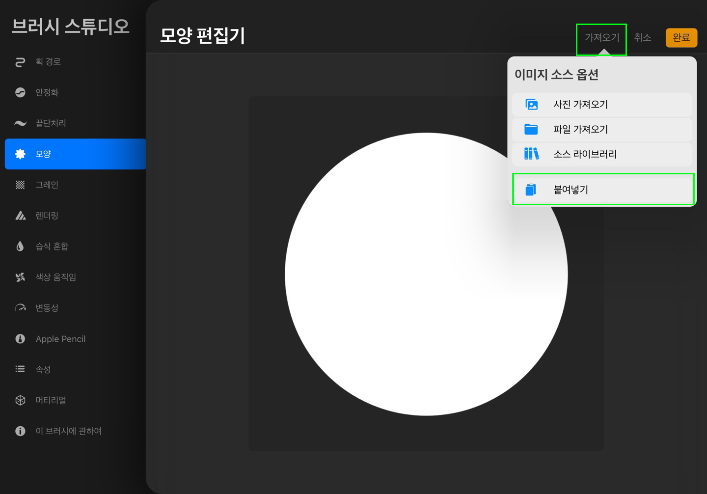 여기서 가장 중요한 것은 화면을 두개의 손가락으로 클릭해 흑백을 반전시켜 줍니다. 이는 모양 편집기 속 소스들의 모양이 흰색이 기본으로 설정되어 있기 때문입니다. 반전을 시켜준 뒤 완료 버튼을 눌러줍니다. 이 완료 버튼은 브러시 스튜디오의 완료버튼이 아니라 모양 편집기의 완료버튼이기 때문에 꼭 눌러주어야 합니다.
